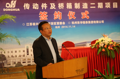 簽約儀式上,董事長宣碧華致辭。他說,東華2007年收購興化齒輪廠,至今已有8年,一直得到了興化市委、市政府和興化開發區的大力支持,使一個當時不太景氣的企業,得到了新生、發展。現在不僅是鏈條行業,齒輪、鏈輪、變速箱、橋箱將同步發展。今天簽約的興化這個項目,我們考慮了東華發展的增量和存量。增量是我們希望到2020年生產總量翻一番,興化的這個土地就是我們的增量空間。存量有兩塊,一是原來我們在外采購的原材料、零部件,拿回來放在興化生產,保證質量;二是現在臨平三廠區制造鏈條要退二進三,騰籠換鳥,把騰出來的廠房做新的項目,比如傳動件超市、輸送機械、CVT變速箱,所以今天我們在這兒舉行簽約儀式,對東華來講是一個很好的發展機會,具有里程碑意義。
