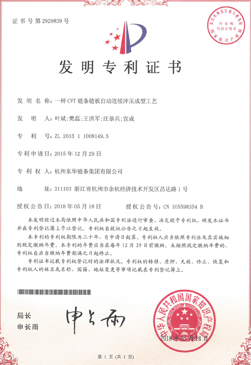 另,2019年12月,集團知識產(chǎn)權(quán)管理體系順利通過中知(北京)認證有限公司的年度監(jiān)督審核,進一步證實了集團公司知識產(chǎn)權(quán)管理體系運行有效性。同時,《2019年度浙江省專利項目績效評價(專利獎)結(jié)果公示》,集團公司“一種CVT鏈條鏈板自動連續(xù)沖壓成型工藝”發(fā)明專利榮獲浙江省專利優(yōu)秀獎。