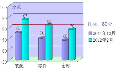 開展檢查評比,落實持續(xù)改善 事業(yè)部不定期對各部門的改善活動進行檢查評價,每月至少2次,覆蓋所有單位區(qū)域,通過TPS專員和組員的聯(lián)合檢查評價,利用《5S評分表》進行打分排名并對改善滯后的員工進行再培訓并達到標準,對活動開展積極,效果明顯的進行獎勵,激勵各單位持續(xù)做好改善工作。檢查評比把重點放在現(xiàn)場的掌握上,通過現(xiàn)場檢查發(fā)現(xiàn)的問題被納入事業(yè)部5S、TPS 的改善對象,列入改善計劃,落實具體改善措施,整個活動基本進入“有檢查、有措施、有落實”的良性循環(huán)。目前現(xiàn)場整體效果良好,基本實現(xiàn)了現(xiàn)場清爽、分類清楚、定置有序的目標,進一步提升了現(xiàn)場可視化效果。