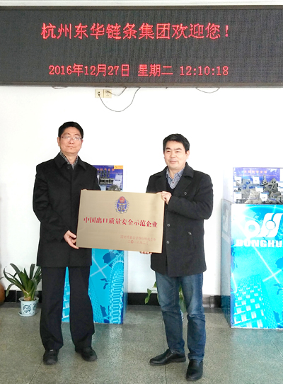12月27日,杭州出入境檢驗檢疫局檢驗監管處何處長與機械科科長一行赴東華集團,代表國家質檢總局為我集團授予“中國出口質量安全示范企業”獎牌。集團副總經理袁立華等高層參加了授牌儀式。