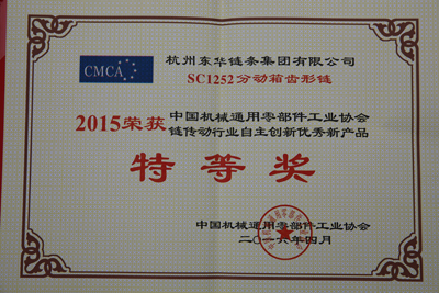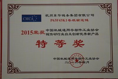 中國機(jī)械通用零部件工業(yè)協(xié)會鏈傳動分會為鼓勵各鏈條制造企業(yè)加強(qiáng)自主創(chuàng)新,不斷研制新產(chǎn)品,每年評比表彰一批各企業(yè)自主創(chuàng)新的產(chǎn)品。東華集團(tuán)每年均有一批自主創(chuàng)新新產(chǎn)品問世,這些新產(chǎn)品不斷推動了中國鏈傳動行業(yè)持續(xù)發(fā)展壯大。東華集團(tuán)被中國機(jī)械通用零部件工業(yè)協(xié)會鏈傳動分會授予2015中國機(jī)械通用零部件工業(yè)協(xié)會鏈傳動行業(yè)自主創(chuàng)特等獎的是SC1252分動箱齒形鏈、P63F43K1卷紙輸送鏈、HV4TT汽車生產(chǎn)線用雙節(jié)距齒形鏈;被授予優(yōu)秀獎的是C2062H ORSD帶密封圈農(nóng)機(jī)鏈和P47.25/55.75F1一次成型內(nèi)單節(jié)農(nóng)機(jī)鏈。